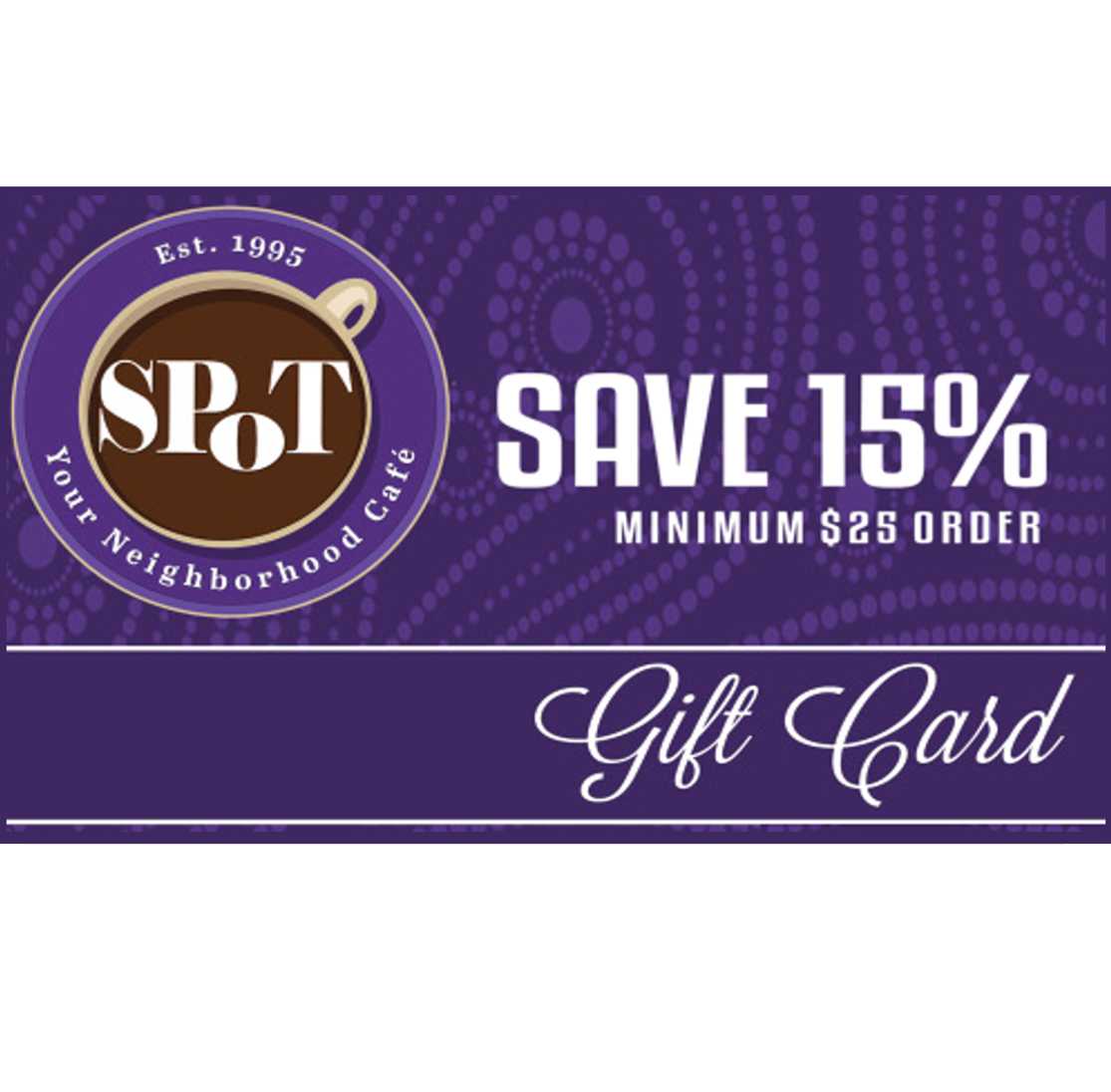Take advantage of our LIMITED-TIME SALE on SPoT Coffee Gift Cards. Physical gift card to be mailed out via first class mail. Delivery within 3 to 5 business days.